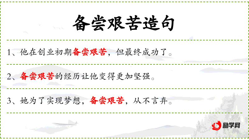 - 艰苦:困难、不易忍受的条件或环境。