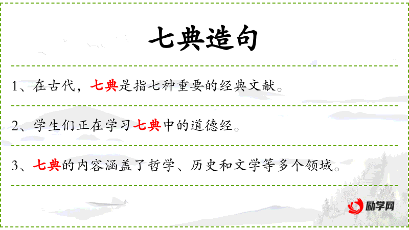 1. 【七典】 七部儒家经典『代提倡"孝治",宣扬宗法封建思想,贵族子弟先授《论语》﹑《孝径》,连同《诗》﹑《书》﹑《礼》﹑《易》﹑《春秋》五经,合称七经或七典。