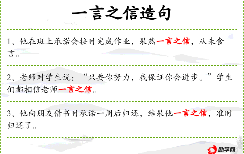 1. 【一言之信】 信:信用。对自己说的话都很讲信用。