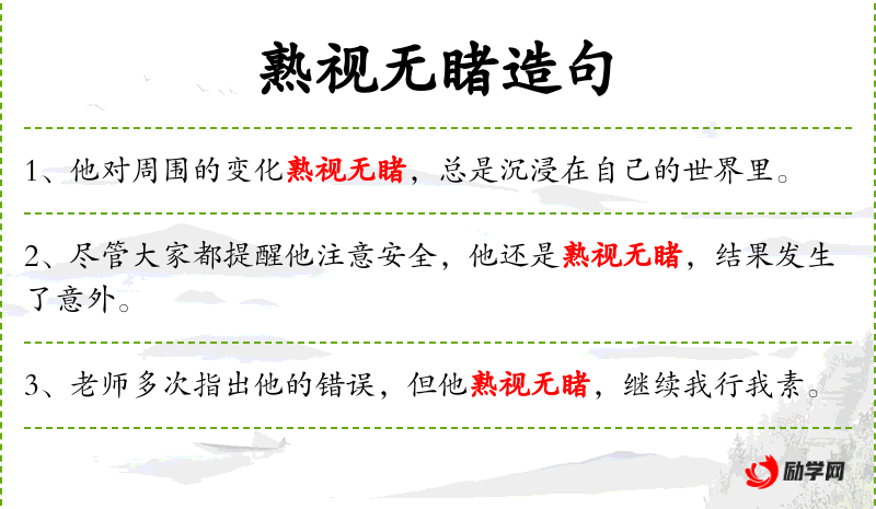 6. 【熟视无睹】 熟视:经常看到,看惯;无睹:没有看见。看惯了就象没看见一样。也指看到某种现象,但不关心,只当没有看见。