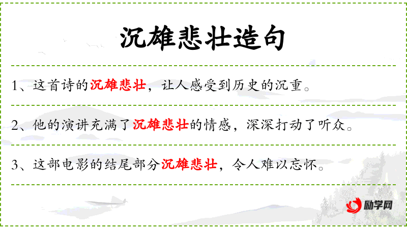 1. 【沉雄悲壮】 - 沉雄:深沉雄健。指深沉雄健,悲壮有力。