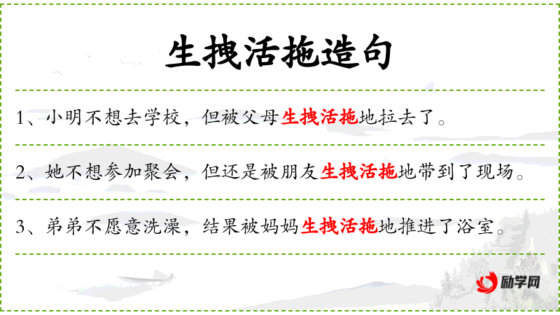 4. 【生拽活拖】 - 拽:拖,硬拉。形容用力拉扯。