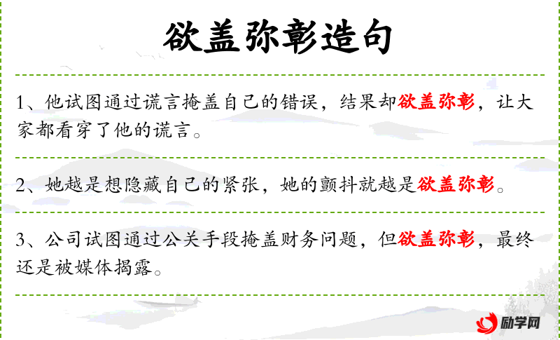 5. 【欲盖弥彰】 盖:遮掩;弥:更加;彰:明显。想掩盖坏事的真相,结果反而更明显地暴露出来。