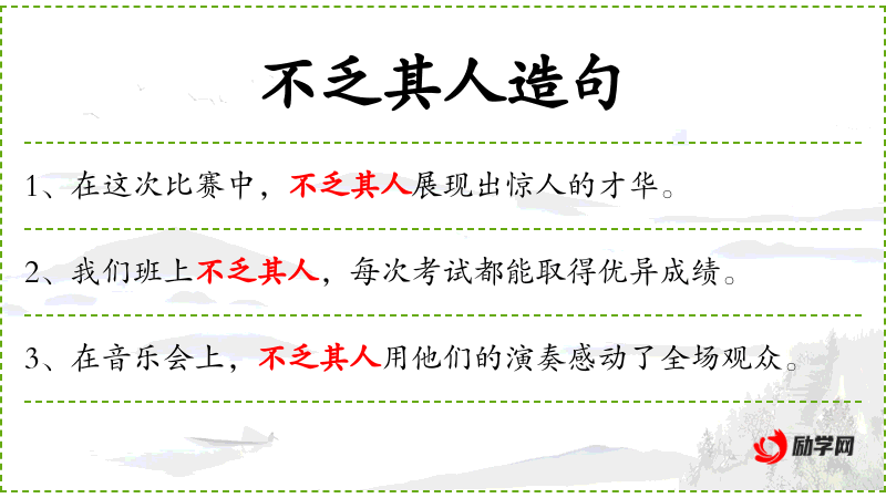 1. 【不乏其人】 - 乏:缺少;其:那,那些。那样的人并不少。