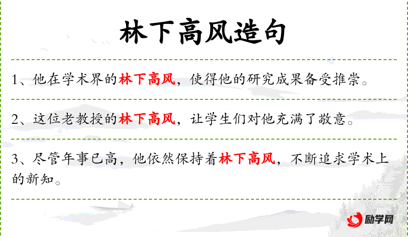 5. 【林下高风】 - 指女子态度娴雅、举止大方。同“林下风气”。