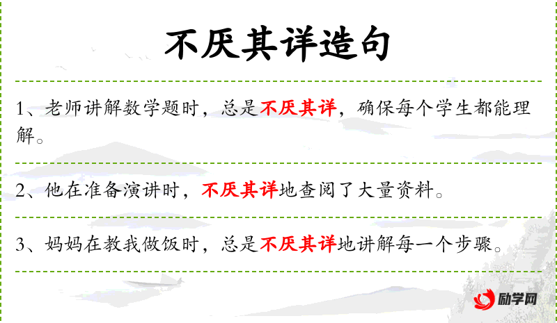 - 不厌其详:形容做事非常细致,不厌烦地详细说明。