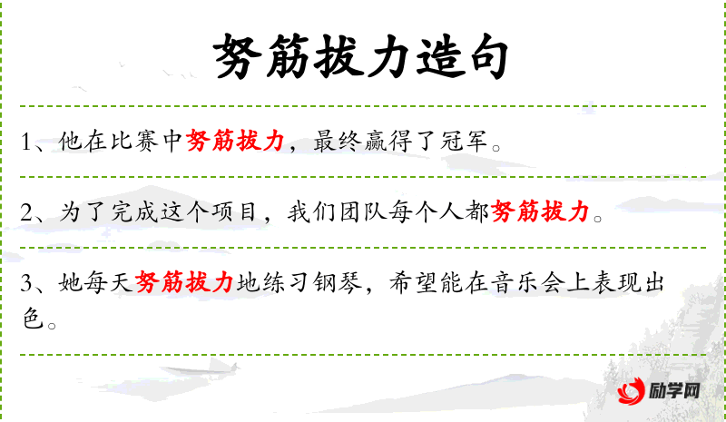 - 努筋拔力:这个成语强调了全力以赴的精神,与**文化中推崇的勤奋和坚持不懈的价值观相符。