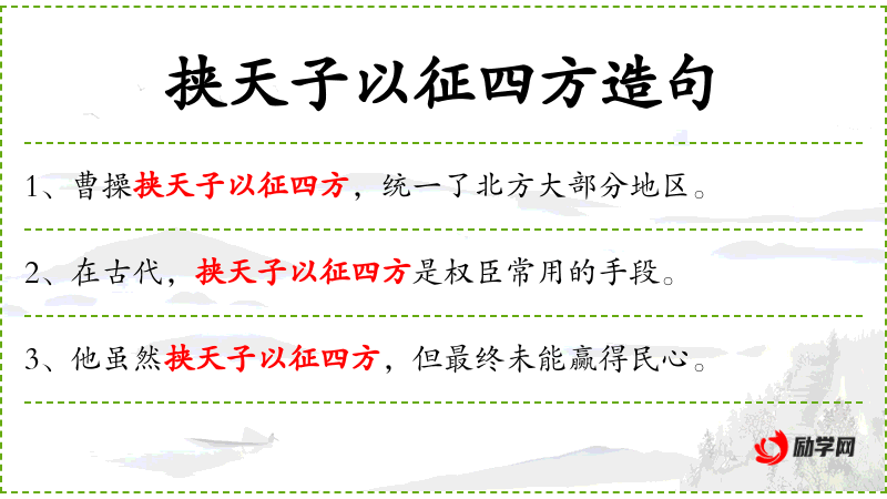 - 挟天子以征四方:这是一个成语,意指利用**的权威来征服四方,通常指在政治或军事上利用中央权威来扩大势力。