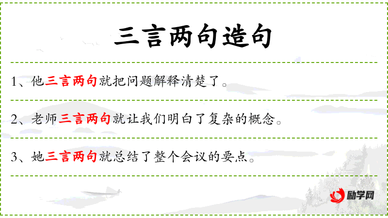 - 三言两句:形容说话简短,几句话就能表达清楚。
