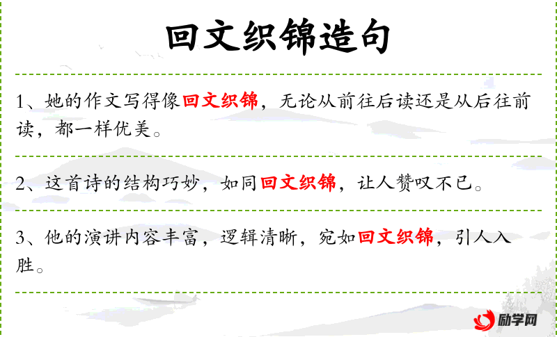 - 回文:指正读反读都能读通的句子,是一种修辞方式和文字游戏。