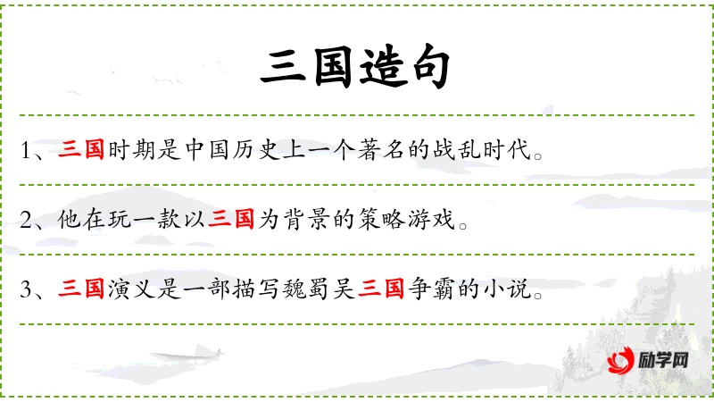 2. 【三国】 魏、蜀、吴三国并立的时期(魏,公元220-265;蜀,公元221-263;吴,公元222-280)。参看1369页“魏”、1215页“蜀”、1387页“吴”。
