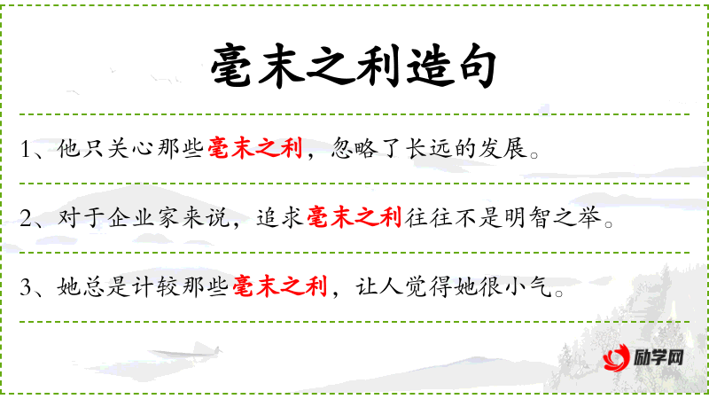 5. 【毫末之利】 - 毫:细毛;末:不重要的,轻微不足道的事物。极微小的利益。