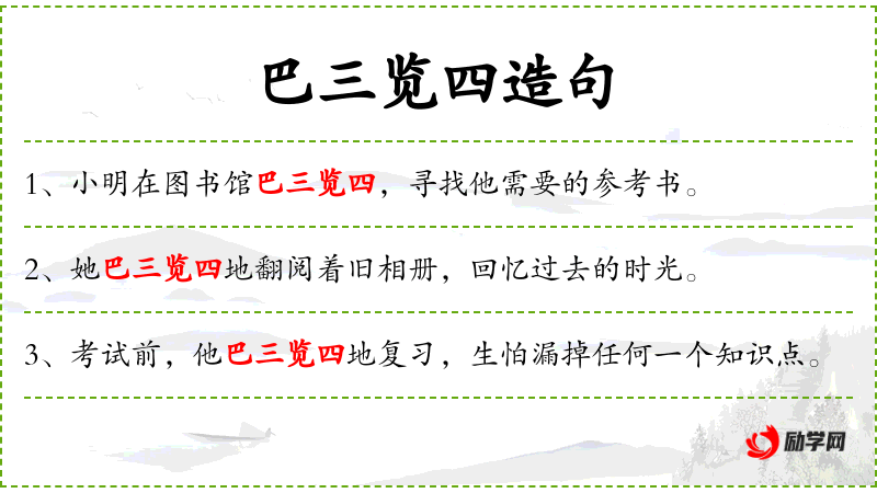 - 巴三览四:成语,形容动作频繁、匆忙。