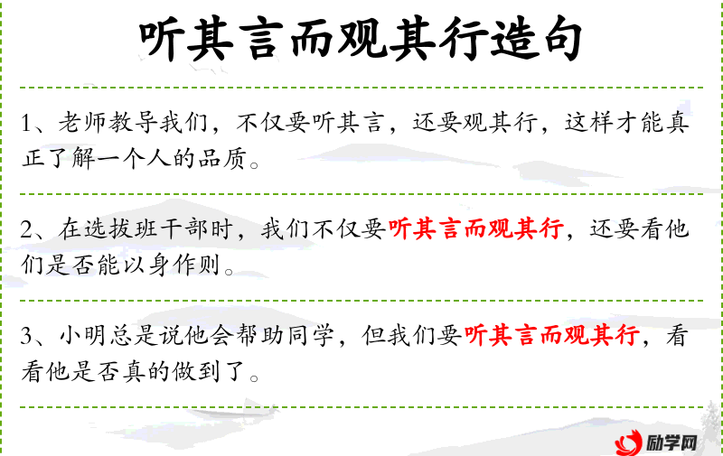- 宾语:听其言而观其行,辨别真伪,不盲目跟风