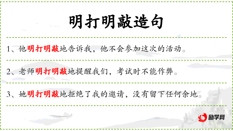 - 明打明敲:形容词性短语,表示直接、不加掩饰地表达。