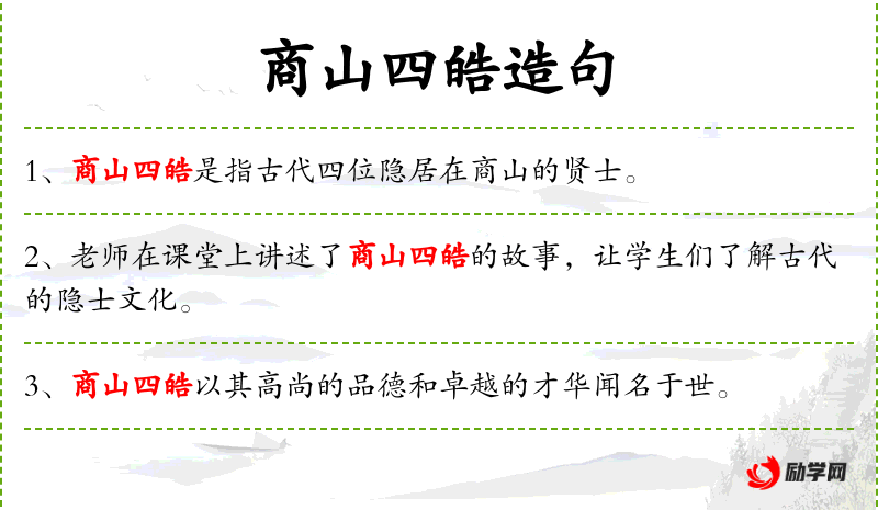 - 商山四皓:指的是东汉末年隐居在商山的四位贤士,分别是东园公、甪里先生、绮里季和夏黄公。