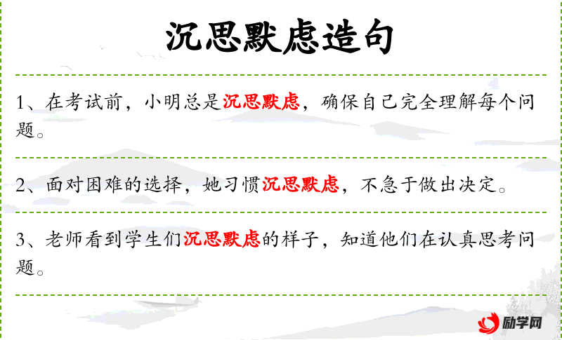 4. 【沉思默虑】 沉:深;默:不出声。深深地思索,默默地考虑。