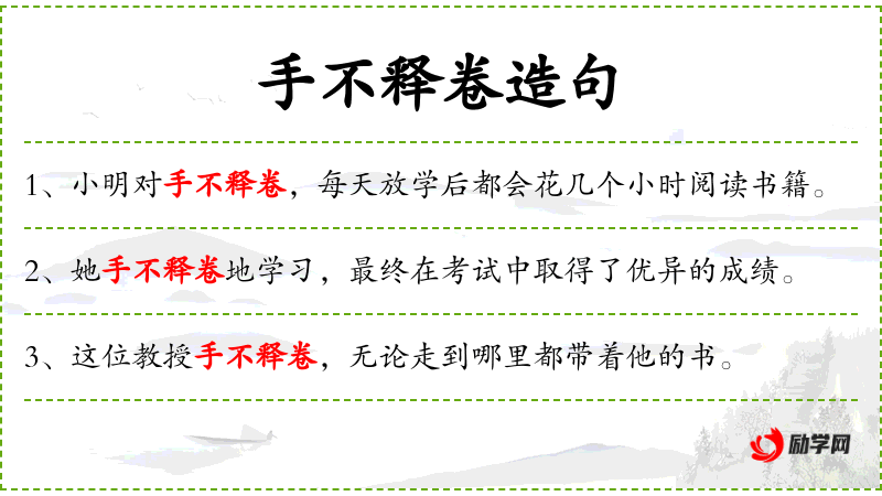 - 手不释卷:成语,形容勤奋读书,手不离开书卷。