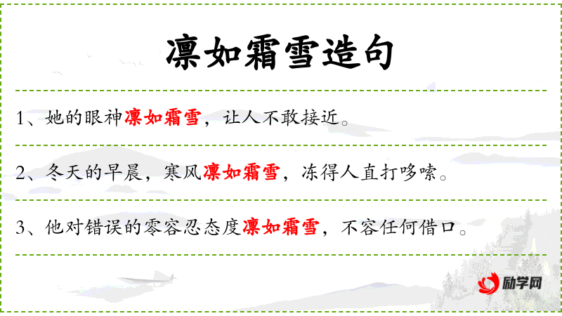 - 成语:“凛如霜雪”可以与成语“冷若冰霜”相比较,都是形容人的态度或言语非常冷酷。