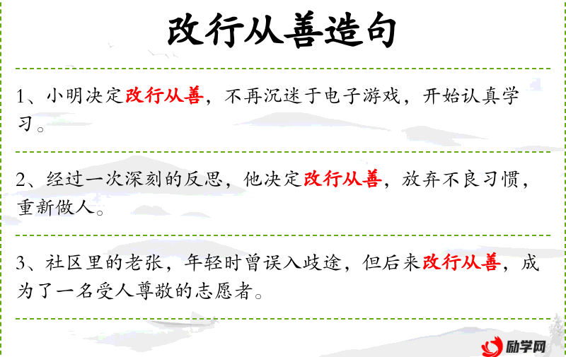 句子:“小明决定改行从善,不再沉迷于电子游戏,开始认真学*。”