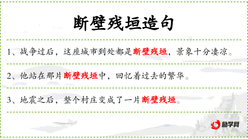 句子:“战争过后,这座城市到处都是断壁残垣,景象十分凄凉。”