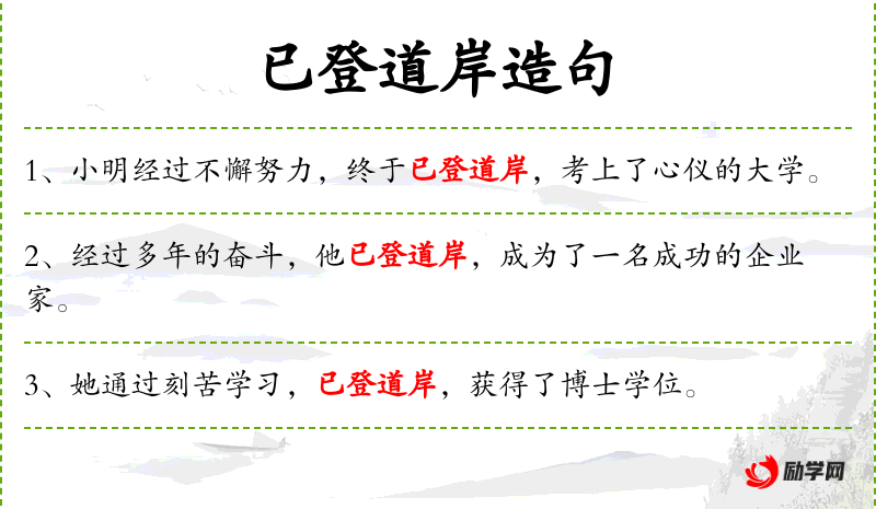 - 已登道岸:这个表达来源于**,比喻达到了解脱或成功的境界。