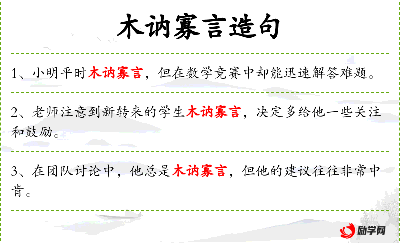 木讷:质朴而不善辞令。质朴而不善于说话。