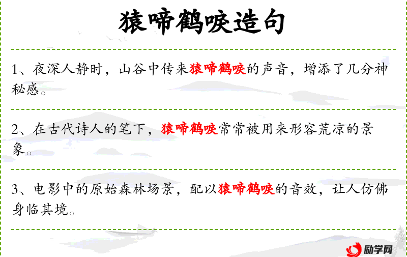 1. 【猿啼鹤唳】 - 猿和鹤凄厉地啼叫。