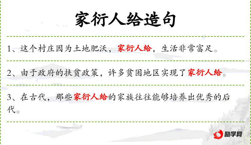 - 相关成语:“家衍人给”可能是一个特定表达,但在标准汉语中不常见,可能是一个地方性或特定群体的用语。