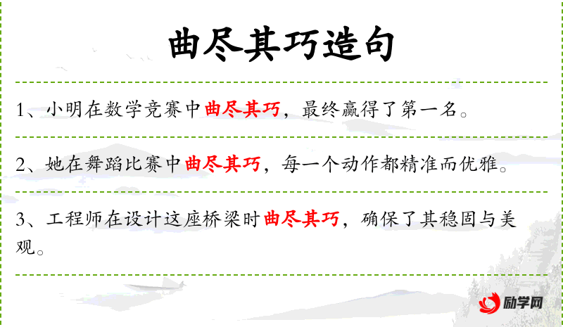 4. 【曲尽其巧】 曲:委婉细致。曲折而委婉地将其中的奥妙之处充分表达出来。