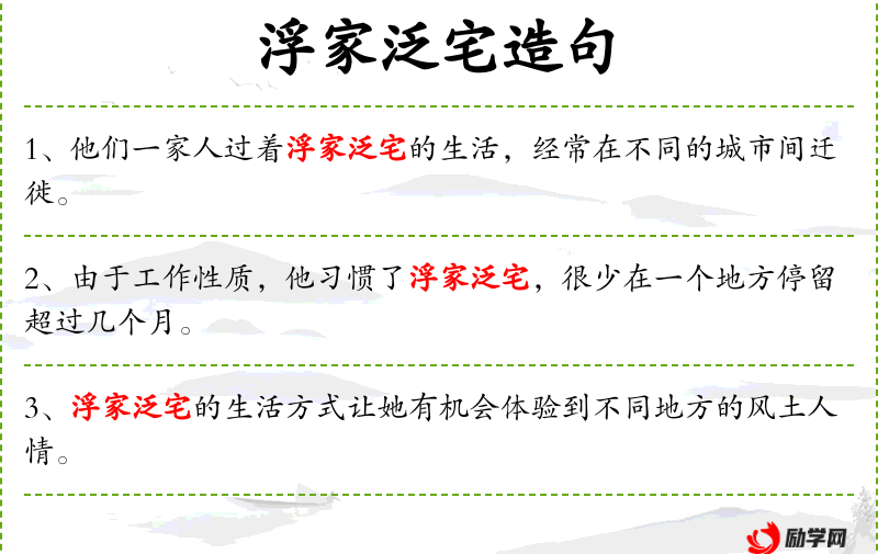 5. 【浮家泛宅】 泛:漂浮;宅:住所。形容以船为家,在水上生活,漂泊不定。