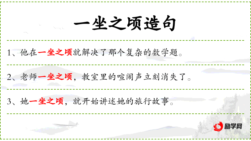 1. 【一坐之顷】 - 一坐:刚一坐下;顷:顷刻。刚一坐下的短暂时刻。形容时间很短。