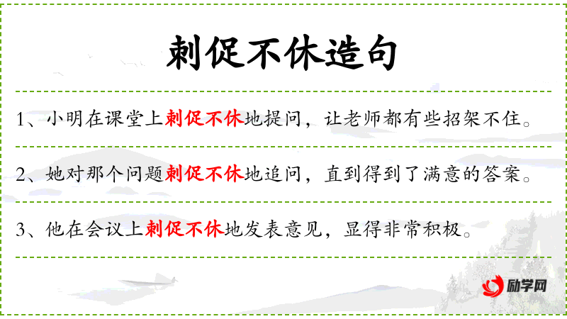- 刺促不休地:孜孜不倦地、不懈地、持续地