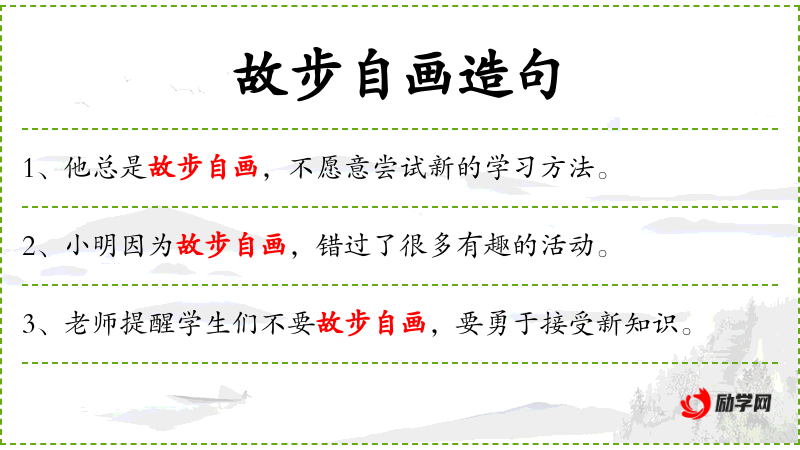 - 故步自画:成语,形容人因循守旧,不思进取。