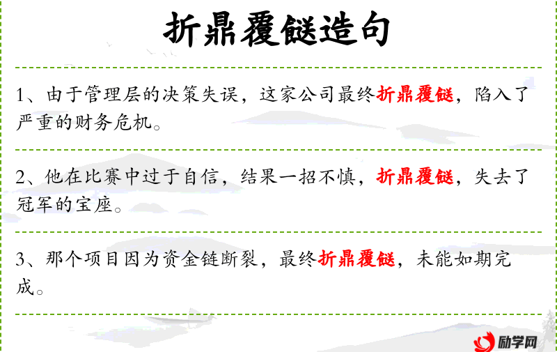 - 折鼎覆餸:成语,比喻因小失大,这里指因为一个小错误导致失败。