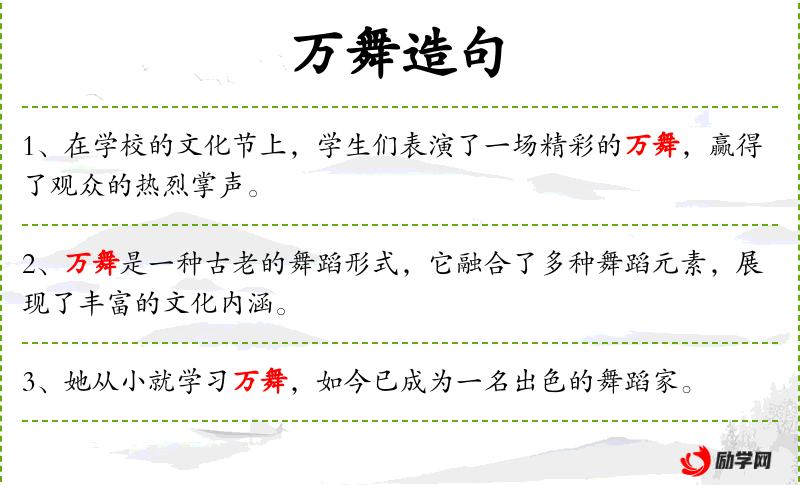 2. 【万舞】 古代的舞名。先是武舞,舞者手拿兵器;后是文舞,舞者手拿鸟羽和乐器。亦泛指舞蹈。