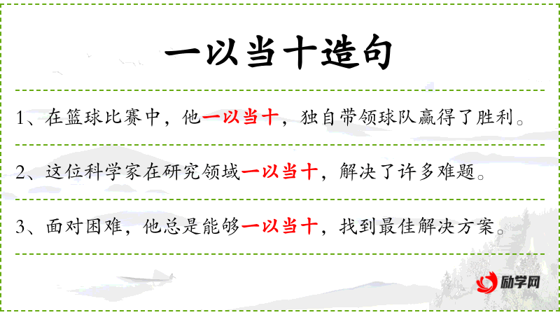 1. 【一以当十】 - 当:相当。一个人抵挡十个人。形容军队英勇善战。