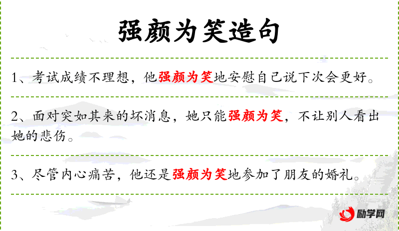 - 强颜为笑:勉强装出笑容,形容词“强颜”修饰动词“为笑”。