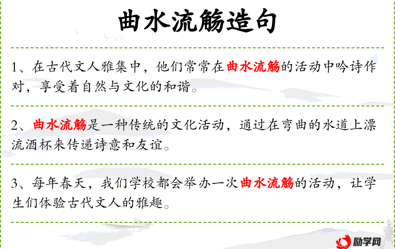 1. 【曲水流觞】 古民俗,每年农历三月在弯曲的水流旁设酒杯,流到谁面前,谁就取下来喝,可以除去不吉利。