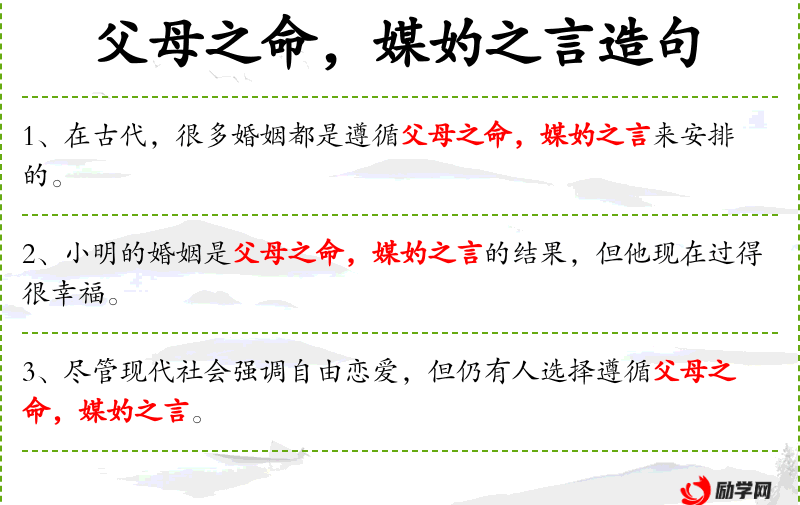 3. 【媒妁之言】 - 媒妁:说合婚姻的人。媒人的介绍。