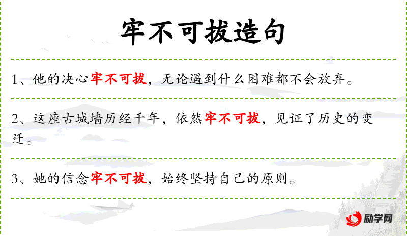 3. 【牢不可拔】 - 牢:牢固。异常坚固,不能攻破。形容人的意志坚定或态度固执、不能动摇。