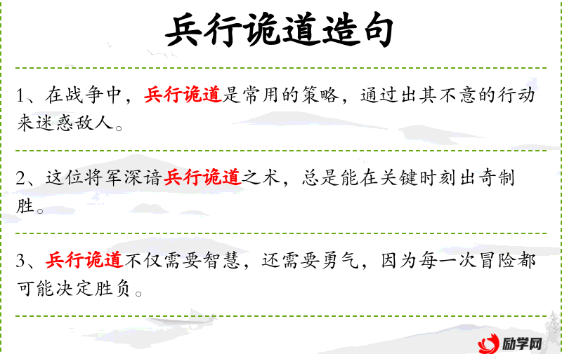 - 兵行诡道:指在战争中采取狡猾、不寻常的策略。