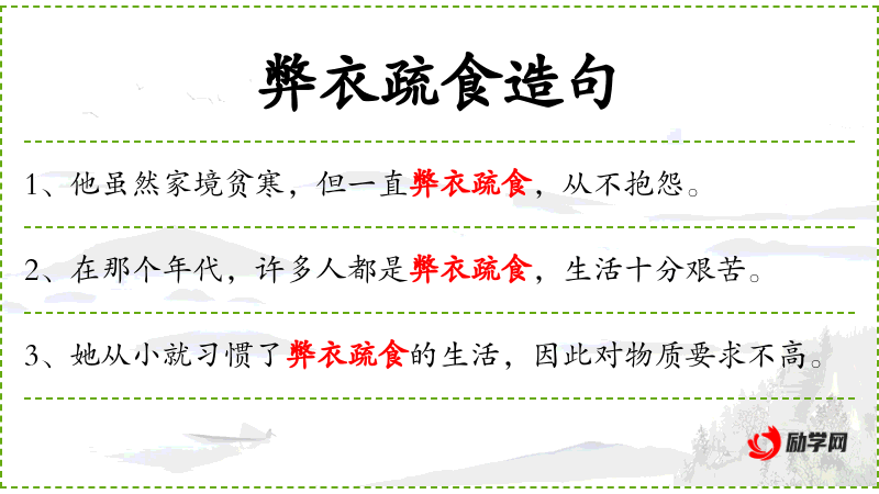 • 弊衣疏食:指穿着破旧的衣服,吃简单的食物,形容生活简朴。