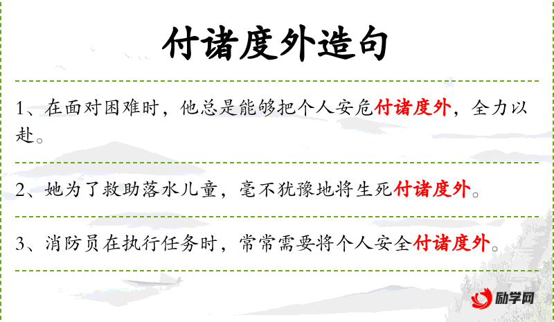 1. 【付诸度外】 度外:心意计度之外。放在考虑之外,形容不计安危、成败的行为。
