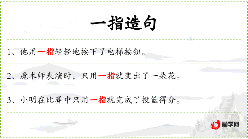 1. 【一指】 - 一个指头; 一次指点,或一下指向; 《庄子.齐物论》"天地一指也,万物一马也。"此谓天下虽大,一指可以蔽之;万物虽多,一马可以理尽,故无是无非◇因以"一指"为齐是非得失之典实; 一个宗旨。
