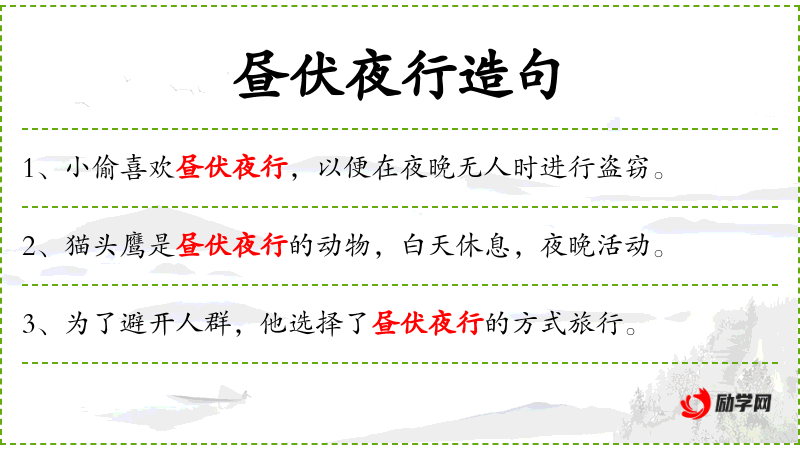 3. 【昼伏夜行】 - 伏:躲藏;行:赶路。白天躲藏,夜间赶路。指为避免被敌人发现所采取的秘密活动。
