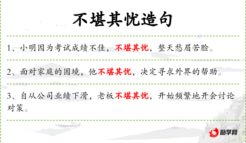 1. 【不堪其忧】 忧:愁苦。不能忍受那样的愁苦。
