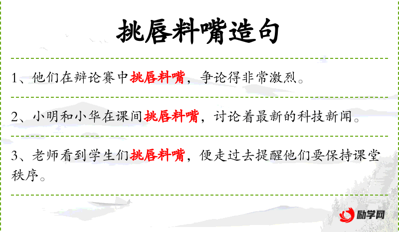 - 谓语:挑唇料嘴,分享