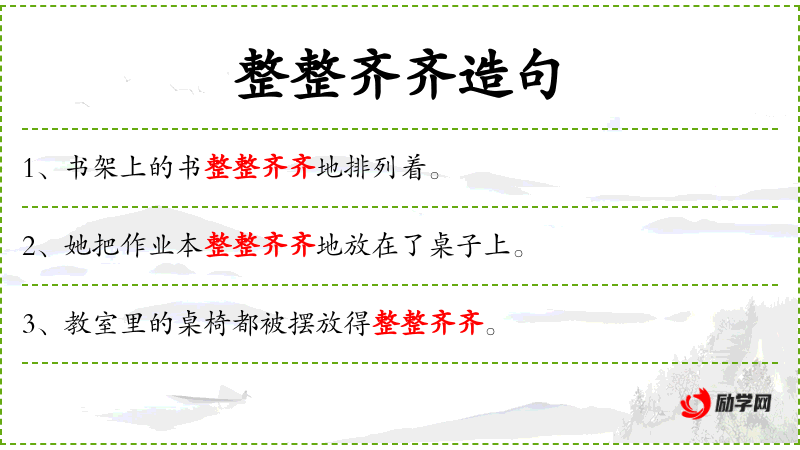 - 整整齐齐:形容词,描述有序、整洁的状态。