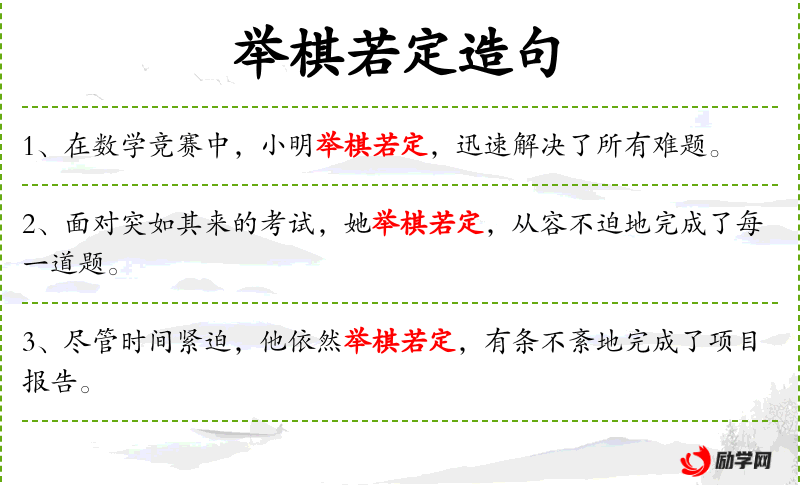句子中的“举棋若定”是一个成语,源自象棋,比喻在紧张或困难的情况下能够保持冷静和理智。这个成语体现了文化中对心理素质和应变能力的重视。